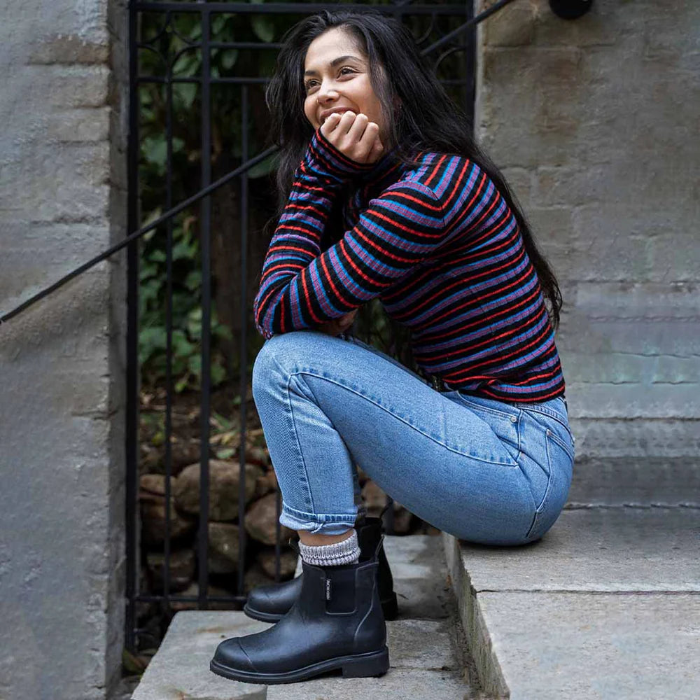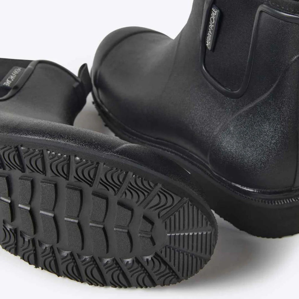 The perfect everyday rain boot. Our best-selling Bobbi Boots blend fashion and function with a quality natural rubber outer and a cushy 4mm neoprene lining. The Merry People Black & Black Bobbi Gumboots are perfect for all-day wear - working in the garden, walking the dog at the park, exploring the woods with your kids, dancing the night away at an outdoor festival, or even at your wedding!