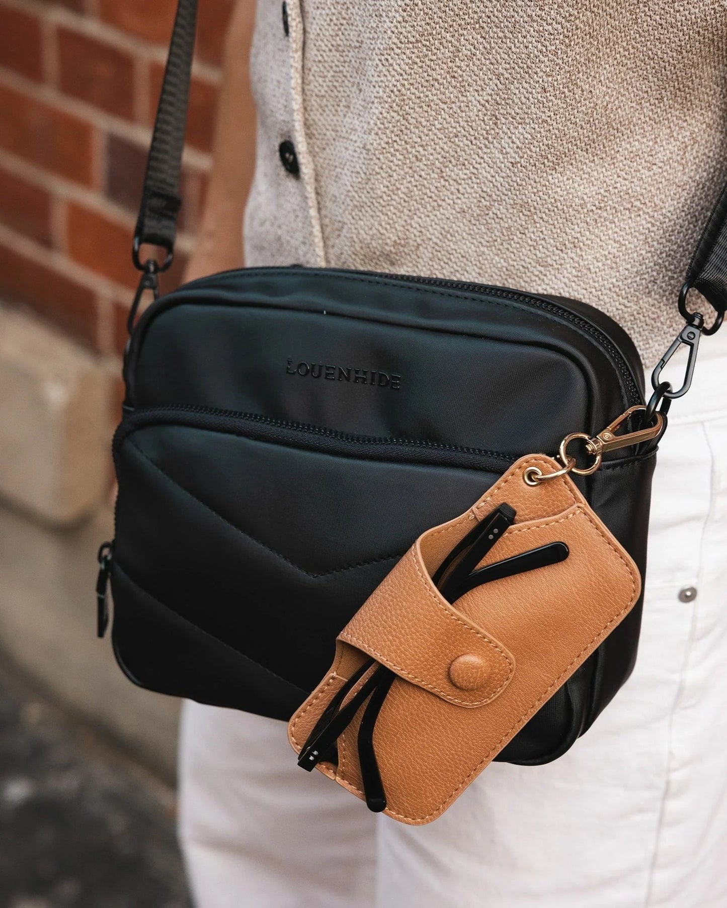 The Louenhide Skittle Camel Sunglass Case is the perfect blend of style and functionality for your everyday eyewear. For ultimate convenience, effortlessly attach to your keys or handbag with the light gold hardware keyring clasp. Without compromising on style, the exterior features a gorgeous vegan leather, while the interior is lined with soft suede material to keep your everyday eyewear protected.